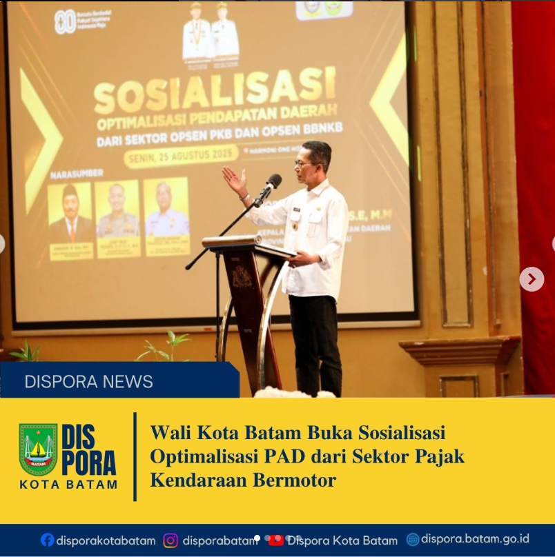 Wali Kota Batam, Amsakar Achmad, membuka secara langsung Sosialisasi Optimalisasi Pendapatan Asli Daerah (PAD) dari sektor opsen Pajak Kendaraan Bermotor (PKB) dan opsen Bea Balik Nama Kendaraan Bermotor (BBNKB). Kegiatan ini digelar di Ballroom Lantai 6 Harmoni One Hotel, Senin (25/8/2025).
